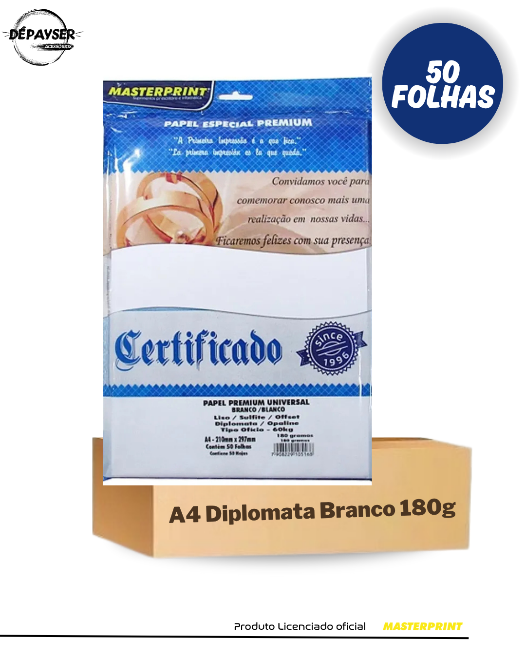 Transforme seus projetos em verdadeiras obras de arte com o Papel Sulfite Diplomata Opaline Liso 180g da Masterprint. Com acabamento liso, branco intenso e alta performance de impressão, ele é ideal para trabalhos que exigem qualidade, resistência e beleza.