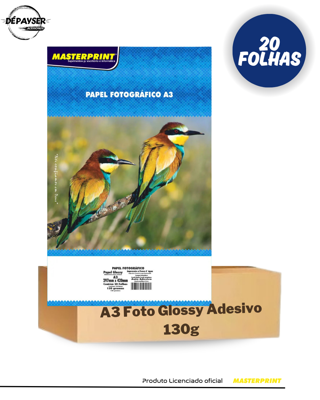 01 Pacote de 20 folhas- Papel Fotográfico Glossy Adesivo A3 130g Masterprint